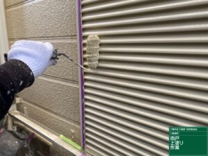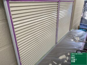 雨戸の上塗り施工中です。